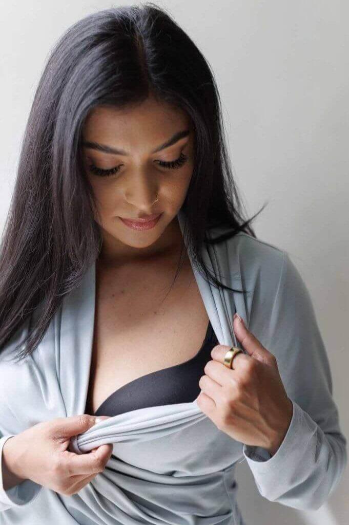 You'll feel great out and about in this shirt. We’ve made our long-sleeve Abbi nursing top with a wide band at the hem for a fitted, flattering look. We said yes to polished, chic draping and no to the big, under-bust nursing flap (that screams I’m a nursing shirt)! The discreet pull-aside surplice-style front makes access to nurse or pump a breeze.