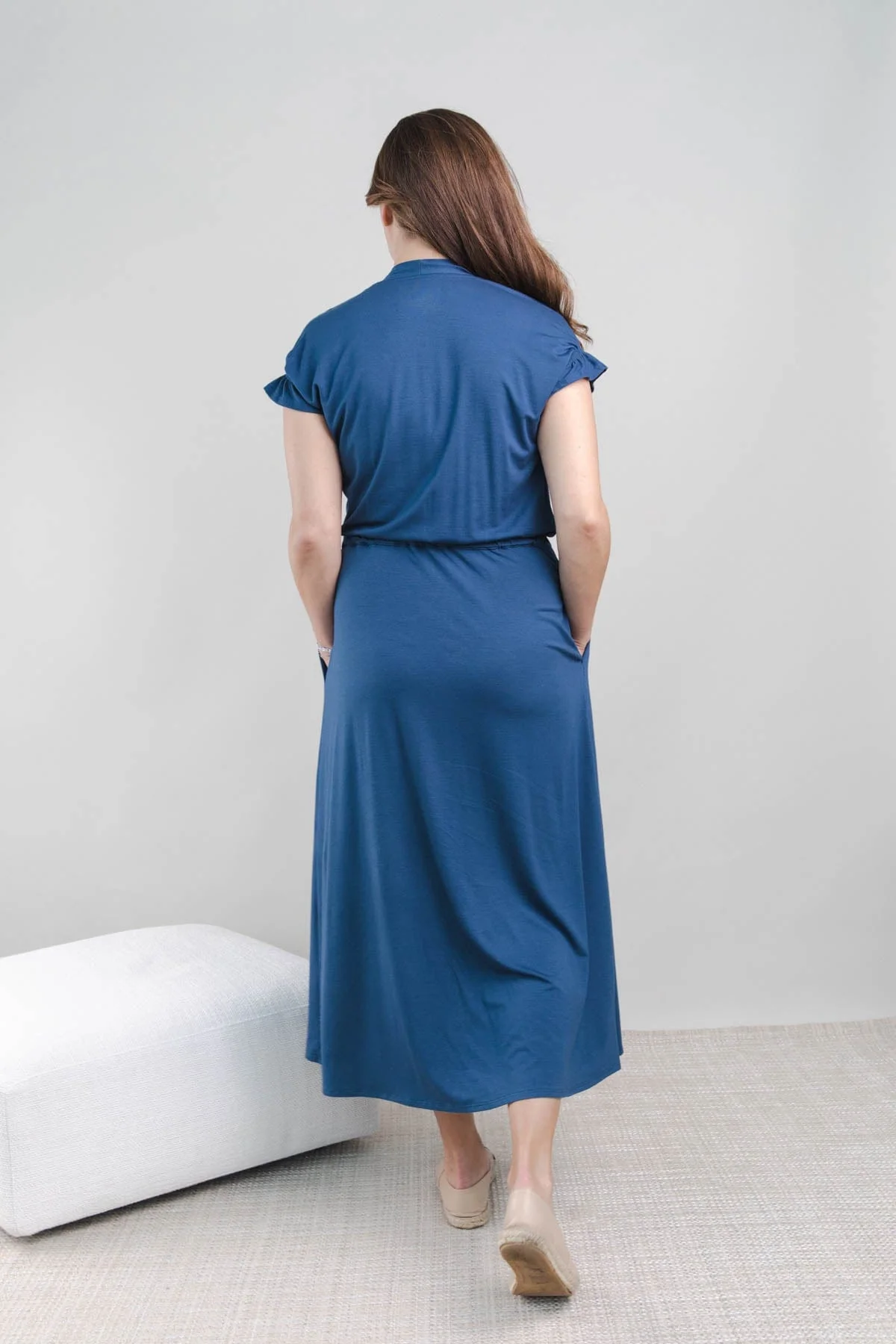 Introducing the Vivian Nursing Dress - a stylish and versatile maxi-length dress designed with pockets to provide comfort and convenience for nursing mothers. This faux wrap dress, with v-neck pull aside access to the breast, makes it a must-have for your nursing wardrobe. If pregnant, the overlap has sufficient coverage for your growing bump.